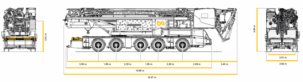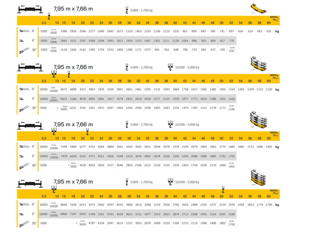 La SK1265-AT5 eLift offre l’impressionante capacità di sollevamento della SK1265-AT6 eLift, ma con un più compatto telaio a 5 assi. Questo la rende estremamente versatile, anche in aree con restrizioni. Con una lunghezza del braccio di 60 metri e una potente tabella di carico, questa gru garantisce prestazioni uniche nella sua categoria.